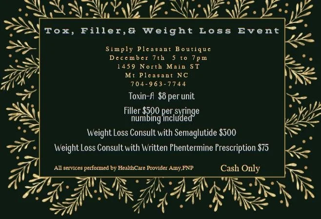 Drop in to Simply Pleasant Boutique Dec. 7 for our Tox, Filler, & Weight loss Event!