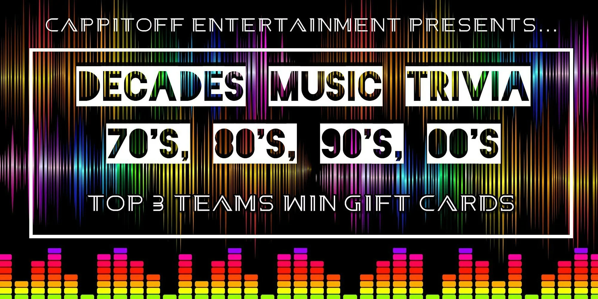 Decades Music Trivia @ Percent Tap House Sunday, January 28, 2024 5:00 PM 7:00 PM Percent Tap House 4250 Main St. Harrisburg Concord, NC (map) Google Calendar ICS Join us 1/28/24 for Decades Music Trivia! 4 rounds of Name-That-Tune from the 70's, 80's, 90's, 00's with a Wager Final Bonus. Totally free to play with prizes for the top 3 teams! Learn more