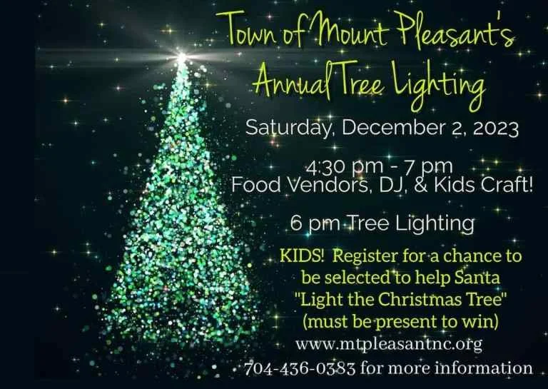 Back to All Events Mount Pleasant Tree Lighting Saturday, December 2, 2023 4:30 PM 7:00 PM Mount Pleasant Town Hall 8590 Park Drive Mount Pleasant, NC, 28124 United States (map) Google Calendar ICS Learn more