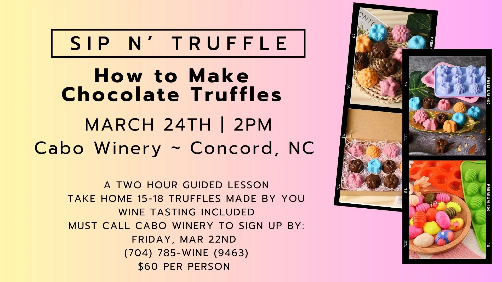 Take home 15-18 chocolate truffles made by you during a two hour guided lesson that includes a Wine Tasting!